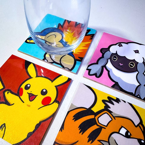 Hechos en madera, con revestimiento plástico resistente al calor y frio, vienen en set de 4, con diseños exclusivos de Pokestop.arg