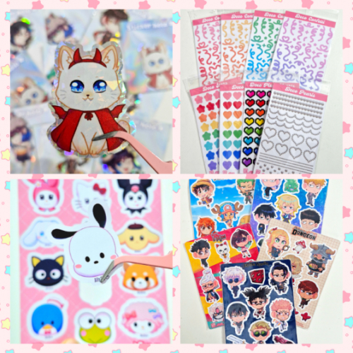 Stickers comunes, planchas de stickers, stickers holográficos y stickers decorativos de distintos animes, juegos y series. Medidas: 5 cm x 6 cm aprox por sticker.