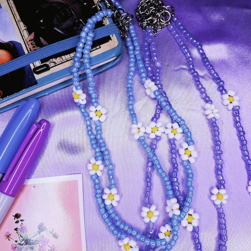 Collar de mostacillas con margaritas, disponibles en celeste y lila.