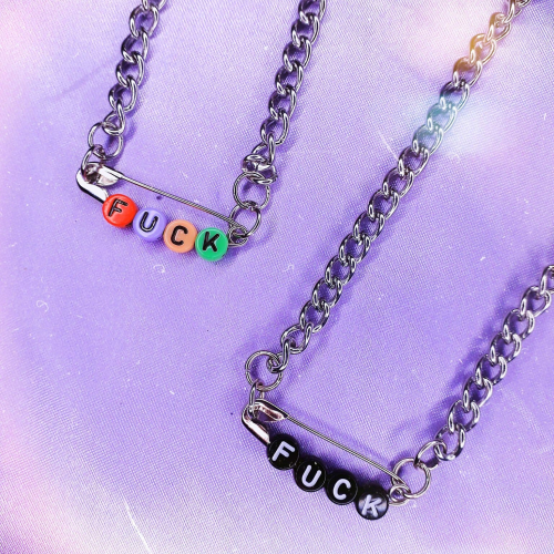 Collar de acero quirúrgico con imperdible con la palabra 'fuck' disponibles en negro y colorido.