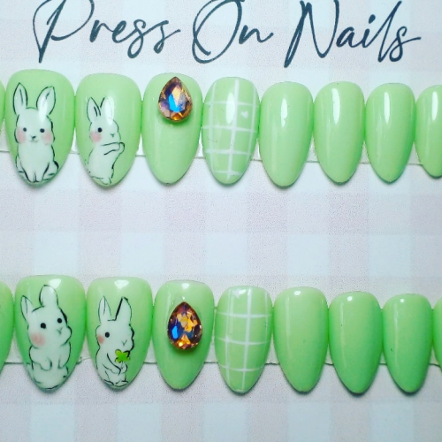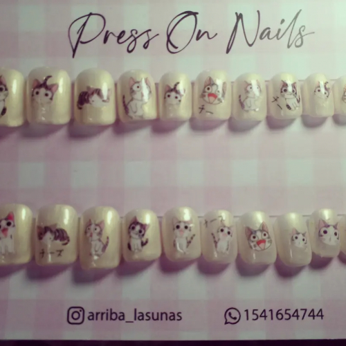 Set de press on con nail art a mano alzada y apliques