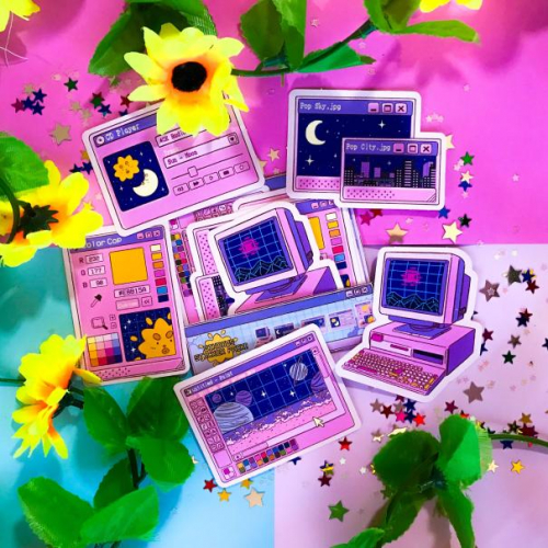 Contiene 5 stickers de vinilo - Elementos de Windows retro (PC-Ventanas-Paint-ReproductrCD-ColorCop)