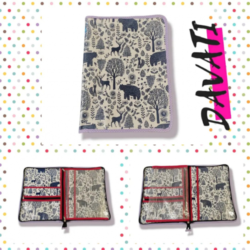 Organizador tamaño A4 con cierre. Tiene 4 bolsillos grandes, uno más pequeño con cierre para usar como cartuchera, un folio y su portada está plastificada para evitar la suciedad. Más de 20 estampados diferentes para elegir.