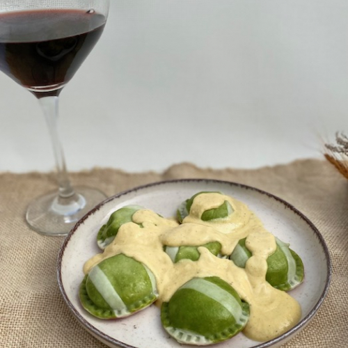 Sorrentinos rellenos de calabaza ahumada y queso con crema de cajú