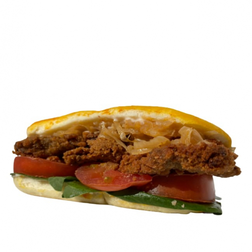 Sandwich de girgolas apanadas, lechuga, tomate y cebolla ahumada con aderezo.