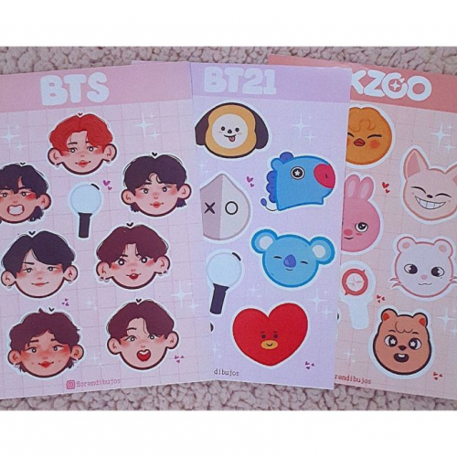 Planchitas de stickers troquelado de BTS y personajes de BT21 y SKZOO