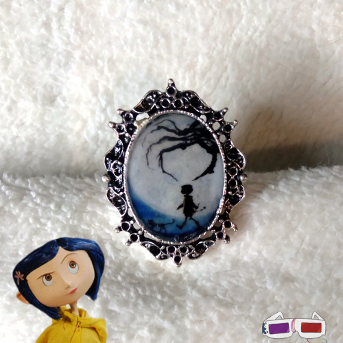 Anillo de metal plateado con un camafeo de 2,5 cm de largo con una imagen en el centro de la película de "Coraline y la puerta secreta". Tiene un estilo victoriano super original e único, ya que es realizado de forma artesanal en resina.