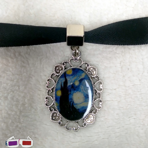 Choker artesanal de cinta gruesa de doble faz con camafeo de fantasía que contiene la pintura "Noche Estrellada" de Vincent Van Gogh, es una clásica pintura del postimpresionismo. El camafeo esta realizado en resina artesanalmente.