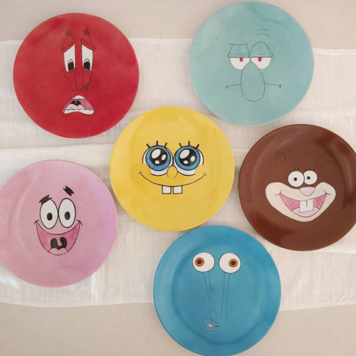 6 personajes de Bob Esponja pintados sobre platos de postre de porcelana de 20 cm. ♡ Producto íntegramente pintado a mano. Cada objeto es único ♡