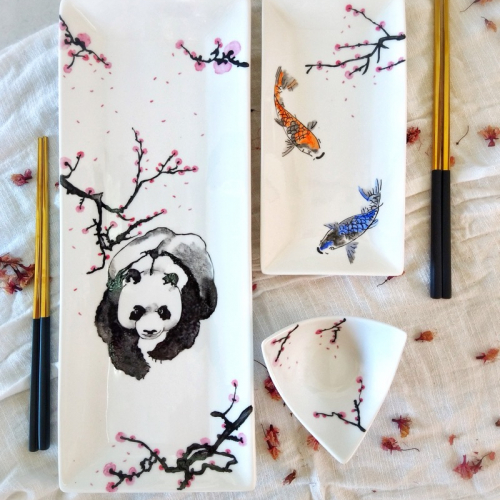 Este set incluye: - Bandeja de porcelana de 36 cm con diseño de panda y flores de cerezo. - Bandeja de porcelana de 20 cm con diseño de peces Koi y flores de cerezo. - Dip triangular pintado con flores de cerezo. ♡ Productos íntegramente pintados a mano. Cada objeto es único ♡