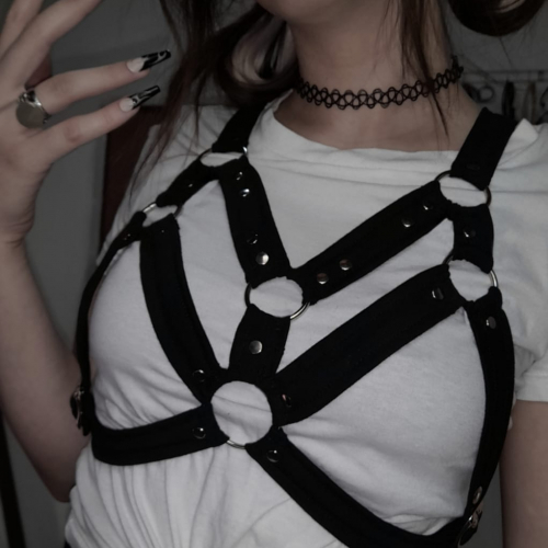 Corpiño de cuerina y cadenitas super goth desde el talle 85 al talle 120.