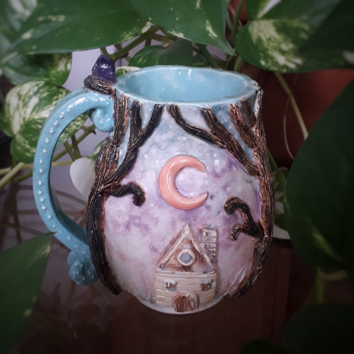 Taza de cerámica modelada a mano. Con una cabaña en medio de un bosque mágico y una incrustación de una amatista real ¡Hay muchos modelos diferentes de tazas!