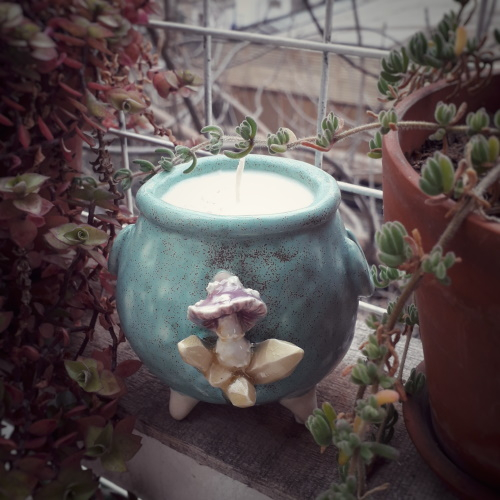 Vela de soja aromatizada con aceite esencial de lavanda e inclusiones de escayas de amatista Viene contenida dentro de un calderito de cerámica decorado con un hongo mágico creciendo entre cristales