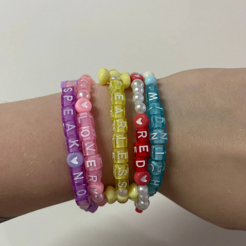 variedad de pulseras con colores y letras