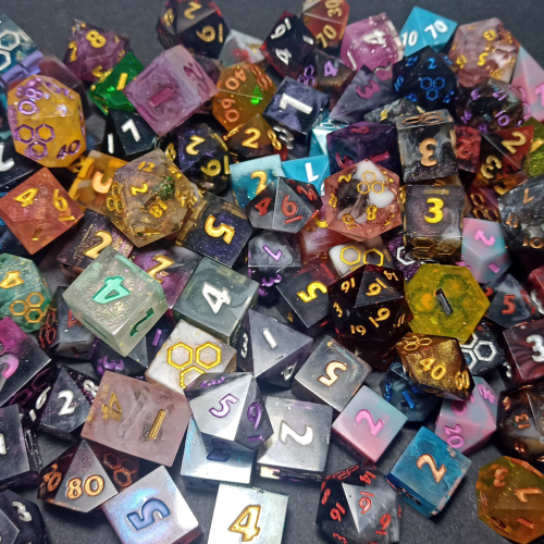 Vendemos dados artesanales de resina epóxica. Tenemos sets de 7 tradicionales, para cualquier sistema de rol así como dados sueltos para quienes quieran expandir su colección.
