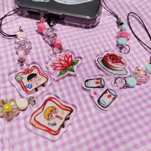 Colgantes para celular de distintos modelos decorado con mostacillas a juego. Ilustraciones propias.