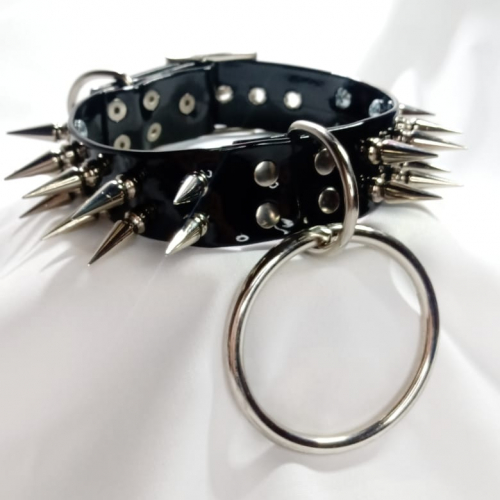 Confeccionado en charol de 25mm, con 20 púas de fundición, argolla grande de agarre reforzado, excelente terminación y hebilla regulable.