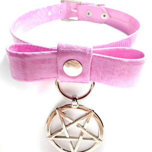 En charol holográfico de 20mm con dije pentagrama, excelente terminación y hebilla regulable.