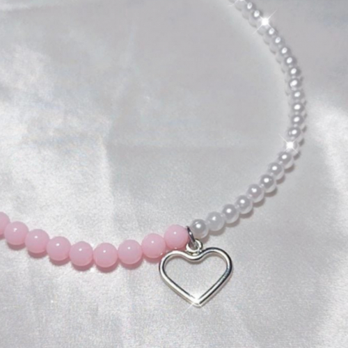 Collar plateado mitad rosa mitad perlas plásticas blancas, con corazón central. Encontra más en la web!