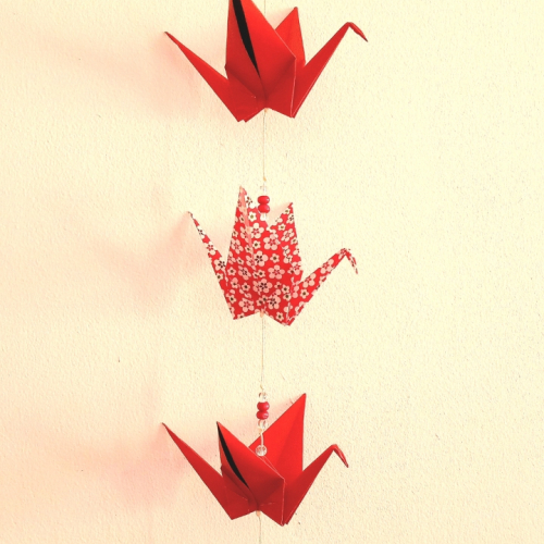 Móvil con grullas y papel japonés. Con detalle de gatito al final.