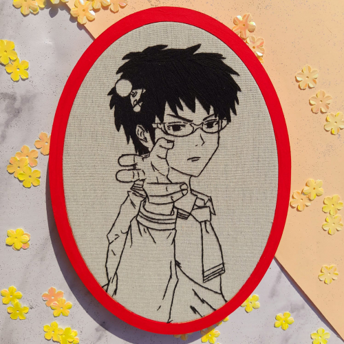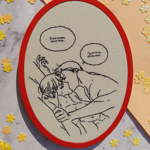 Bordado sobre lienzo en bastidor de 12x17 cm (el marco es rosa fluo pero ve se rojo en la foto, les juro que es rosa ajjsja)