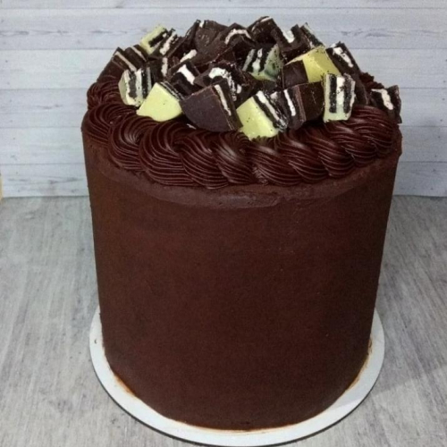 Torta Bruce rellena de ganache de chocolate y oreos. Cobertura de ganache de chocolate y oreos bañadas en chocolate blanco y negro.