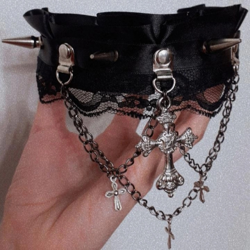 Collar con base de eco cuero, cierre con hebilla, base cinta arcoiris, tira de encaje negro, tachas y dijes varios de cruz.