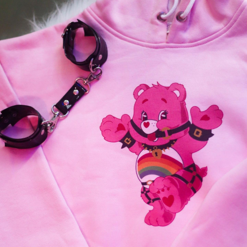 Maxi buzo rosa pastel con diseño del osito cariñoso BDSM. Disponible desde el talle S al L, en rosa pastel y blanco/mangas negras Remeras Osito Cariñoso BDSM talles desde el S al XXL, rosa pastel, coral y blanco.