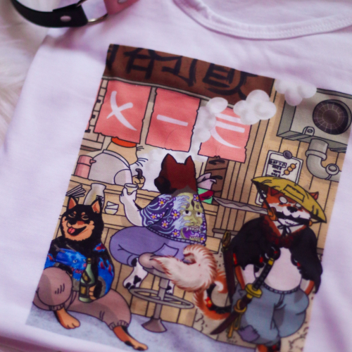 Remera sublimada con el diseño Dog Ramen. Disponible desde el talle S al XXL en blanco, coral y amarillo pastel. Buzos desde el talle S al L blanco con mangas negras y gris con mangas negras.