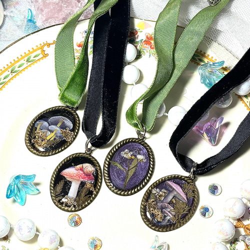 Collar tipo gargantilla de terciopelo con dije de honguitos y flores reales.