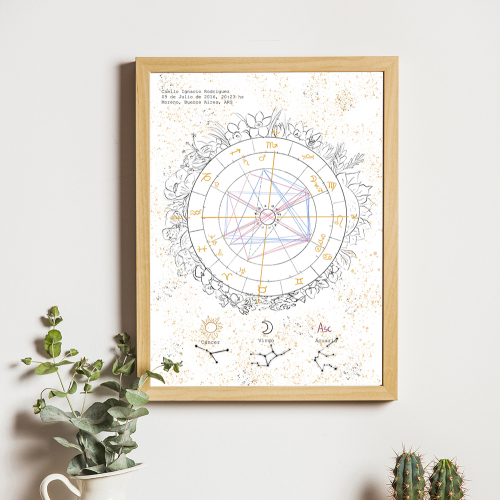 Carta natal personalizada a partir de tu fecha de nacimiento, ilustrada y enmarcada.