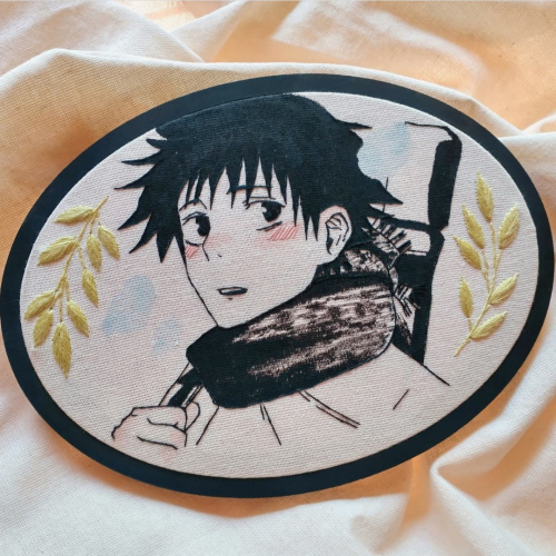 Bordado en bastidor ovalado, pintado a mano. Tela de lienzo, hilos dmc