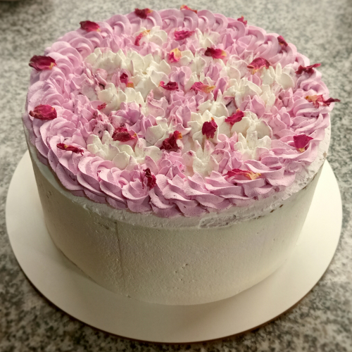 Torta con bizcocho de limón y arándanos, crema vegetal con reducción de arándanos y garnish de pétalos de rosa.