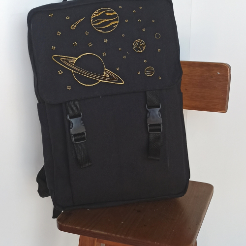 Medidas; 45cm x 32cm x12cm aprox. Tres bolsillos externos y uno interno. Ilustración bordada.