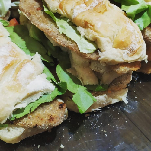 Sandwich con pan casero tipo pebete, milanesa de seitan al horno, lechuga, tomate y veganasa