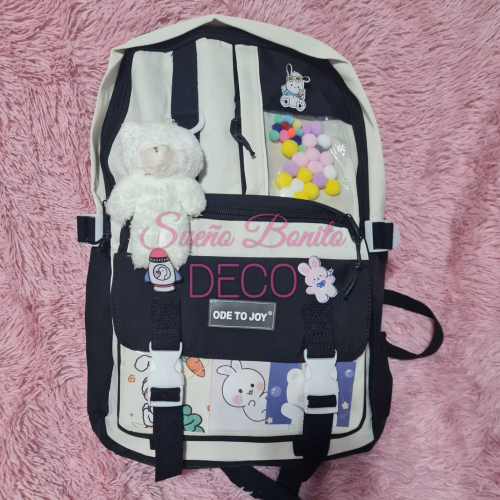 Mochila ODE TO JOY pompones. Incluye osito de peluche, pompones, 3 pins y 3 tarjetitas.