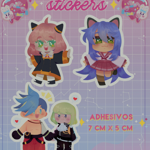 (Imagen a modo ilustrativo) Adhesivos de series, anime y juegos en acabado mate y holográfico.