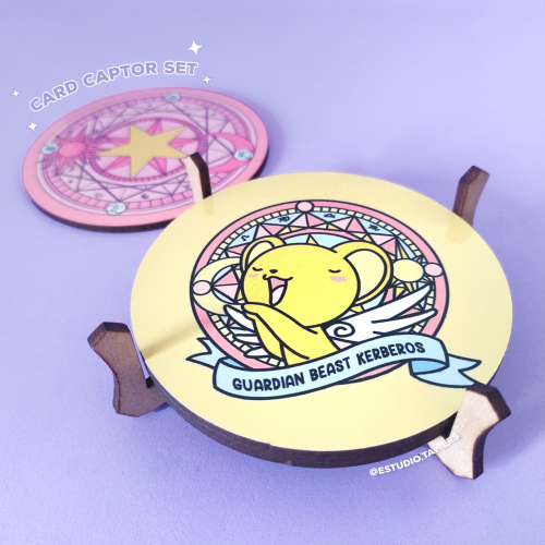 Decora tu mesa o arma tu Set Up kawaii con estos posavasos pastel de Sakura Card Captor♥ Contiene: Posavaso Kero Posavaso Spinel Posavaso momo Posavaso Sello Madera brillante, no se arruina con el agua. Muy facil de limpiar.