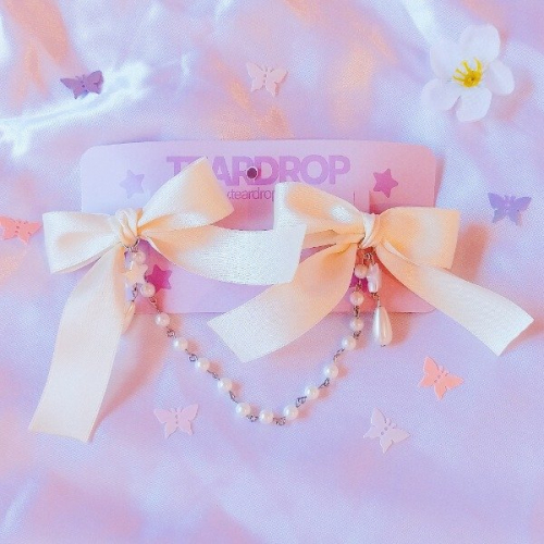 hebillitas de moños hechos a mano con cinta de raso en color crema (disponible también en negro, rosa, lila y cereza) con hebilla francesa conectadas por una tira de perlas blancas. ideal para todos tus peinados!