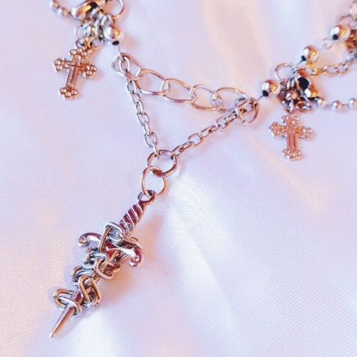 collar regulable con dije de espada customizado con cadenas a su alrededor, dijes en forma de cruces y corazones, y perlas metálicas.