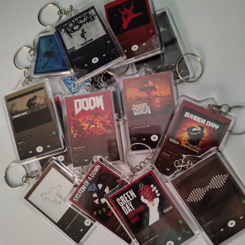 Llaveros con canciones de Spotify, de material acrílico y hecho con papel de vinilo durable en el tiempo. Cada uno tiene su respectivo código que al escanearlo con la app reproduce la canción y te lleva al álbum.