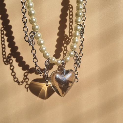 Collar único con perlas de vidrio, dije de corazón de vidrio y cadenas de acero inoxidable ♡ Largo regulable: 8,5 cm - Largo total: 44 cm