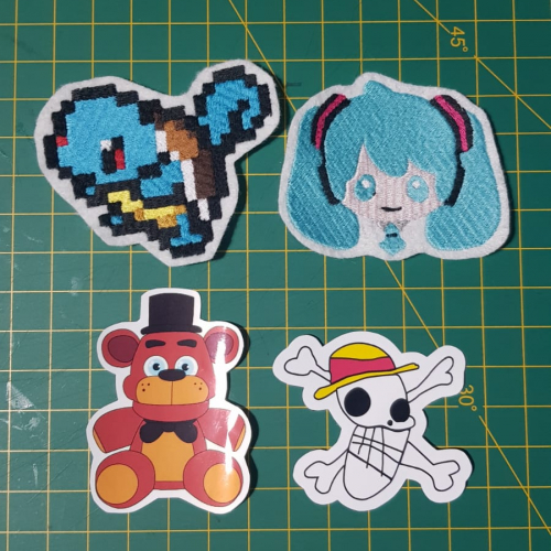 Parches bordados y stickers en vinilo blanco y holográficos de temáticas varias. También hacemos personalizados.
