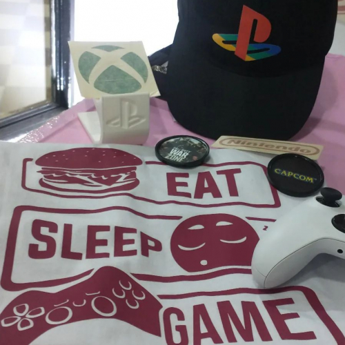 Remera estampada en vinilo textil Pines sublimados a prueba de agua Gorra trucker estampada en vinilo Soporte para joystick en impresión 3D Strap y llavero destapador