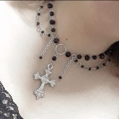 Collar con piedritas, mostacillas, cadena y dije de niquel.