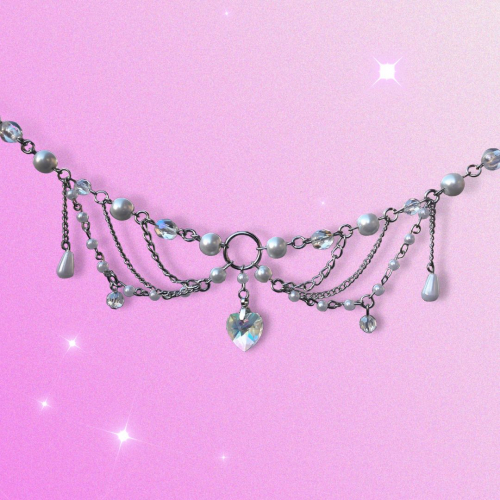 Collar con piedritas, mostacillas, cadena y dije de cristal.