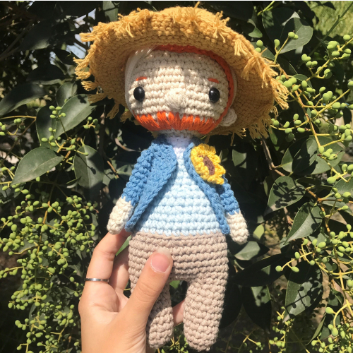 Van Gogh, reconocido pintor neerlandés tejido en hilo de algodón hipoalergénico con una venda en la cabeza representando la falta de su oreja izquierda y un sombrero de paja. Su tamaño es de 21cm de alto.