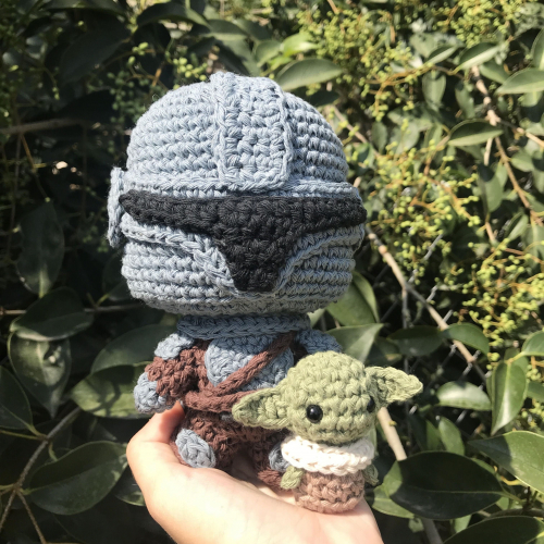Mando junto con Baby Yoda personajes de la película The Mandalorian. Ambos tejidos en hilo de algodón hipoalergénico. Mando mide 17cm de alto y Baby Yoda mide 6cm.