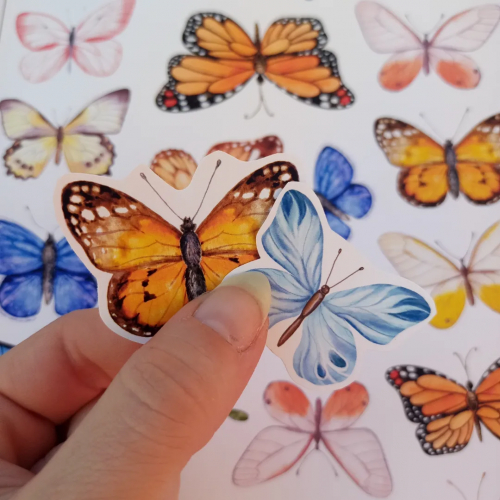Stickers temáticos autoadhesivos en papel mate, glossy, acetato, y demás. Mariposas, flores, hojas, marcos, gatitos.
